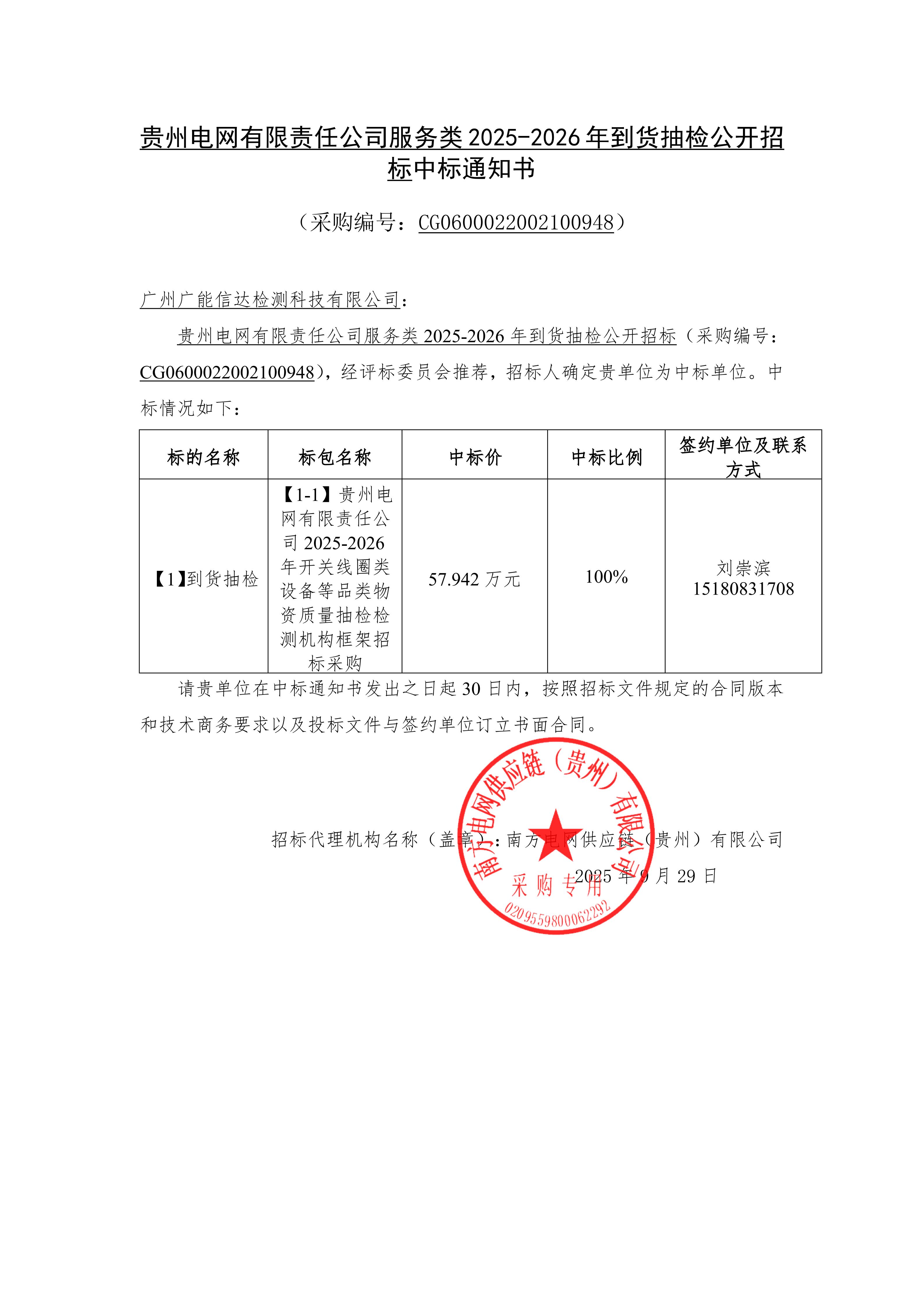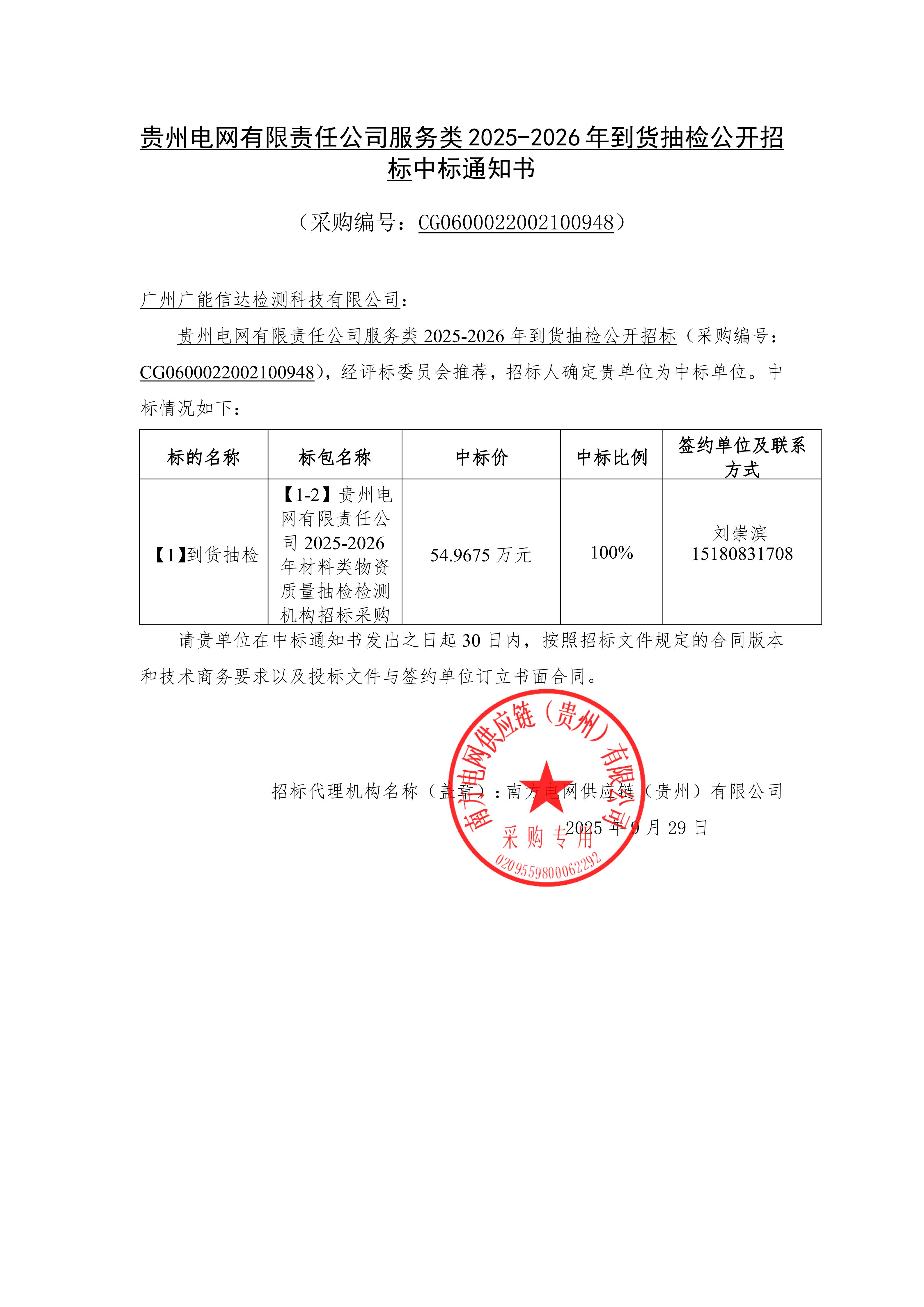 热烈祝贺我司以其卓越的技术实力、丰富的行业经验和良好的信誉,成功中标 贵州电网有限责任公司服务类 2025-2026年到货抽检公开招标项目。