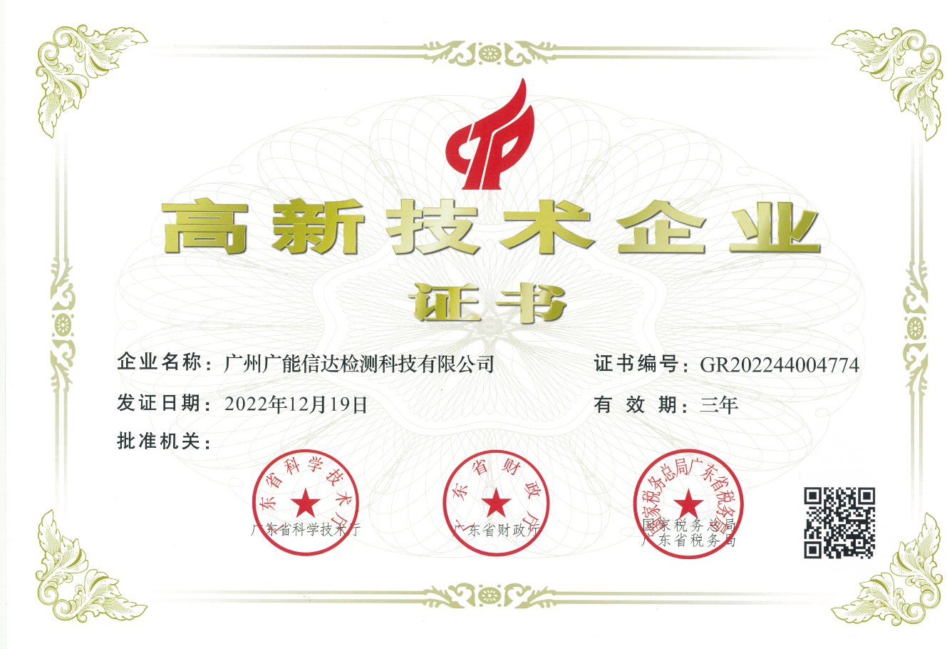 广州广能信达检测科技有限公司是一家拥有国家CMA资质,CNAS资质的第三方检测机构。2019年12月公司荣获由广东省科学技术厅、广东省财政厅、国家税务总局广东省税务局批准颁发的“高新技术企业证书”。此次证书的取得不仅是对我们企业管理能力和整体技术水平的肯定和认可,同时也是对我们的一种激励。我们将继续围绕科研项目的开发,进一步提高技术服务的能力,提升公司的专业形象。不断加强研发投入,提高技术创新能力,提升服务水平,充分发挥高新技术企业的优势和模范带头作用。